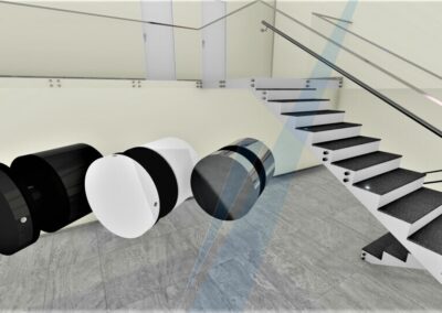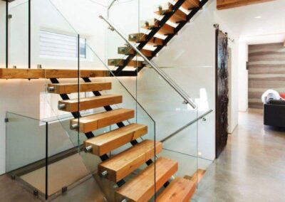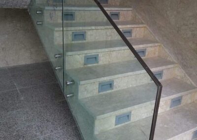 Guarda-corpos em escadas devem obedecer à mesma limitação de afastamento descrito acima em “Espaçamentos mínimos dos vãos abertos nos guarda-corpos”. Na zona dos degraus, o afastamento do último elemento horizontal em relação à aresta exterior do piso deve ser menor ou igual a 0,05 m.