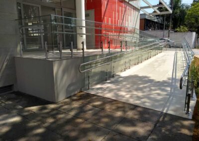 O espaçamento entre o elemento horizontal inferior do guarda-corpos e a borda exterior do pavimento não pode permitir a passagem de um gabarito esférico com 0,09 m de diâmetro.